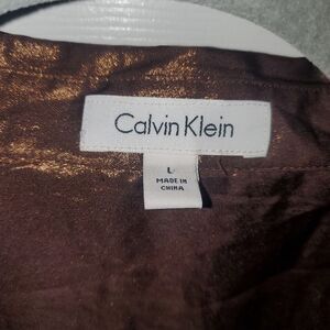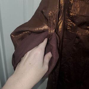 Shimmering metallic brown shirt. Button-down style. Long sleeves. Perfect for a chic look.