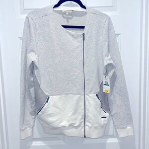 New with tags women’s Calvin Klein jeans denim, active zip up sweatshirt jacket . Size large new condition. New with tags. Colors are tri-colored with an off-white heather gray and gray two zippers with pockets on each side asymmetrical zip in the front.