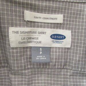 Old Navy Signature Shirt, Slim Fit is cotton and spandex. Gray and white checked pattern.