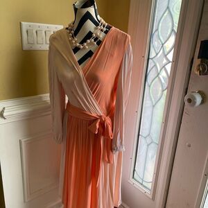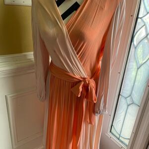 Calvin Klein color block Surplice Faux Wrap Dress in blossom,peach & cream SZ12 Features a stylish tie waist and flowing sleeves.gently used see all pictures any questions please message .