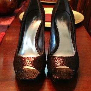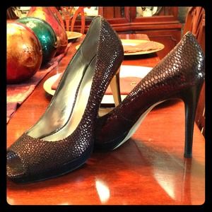 Peep toe pump with a, 4 1/2 inch heel & 1 inch platform. Shoe color is a deep burgundy snakeskin. Heel and platform color is black.