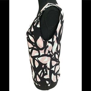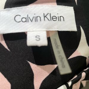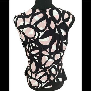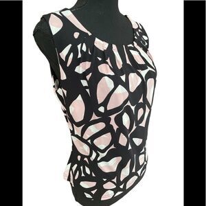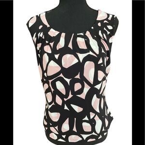 Calvin Klein sleeveless abstract print top, size S. Colors are black, white, blush pink. Soft pleating with stitched details around the round neck. Pull on style. Polyester spandex blend. Approximate measurements are pit to pit flat 19”, length from shoulder approximately 21”. Would look great with white shorts or pants, or under a jacket.