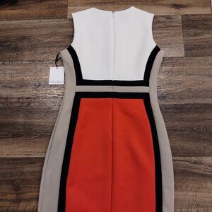 Beautiful Calvin Kline Colorblock Pencil Dress in Size 6 - NEW WITH TAGS! The dress has the colors: cream, tan, black, and redish coral like color. The inside label is loose on one side (see pics) but does not affect the dress in any way. Measures 38in from shoulder to hem. Smoke-Free Home.