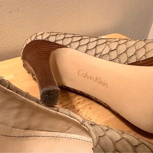 Step out in style with these elegant Calvin Kline taupe 5.5” platform heels. Fish Scales pattern with wood. EUC. Lots of life left.