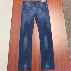 Condition consistent with age of jeans/Excellent used condition/tinted purple/Factory distress on the front & back