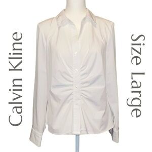 This Calvin Klein Blouse is guaranteed authentic. It's crafted with 100% Polyester.