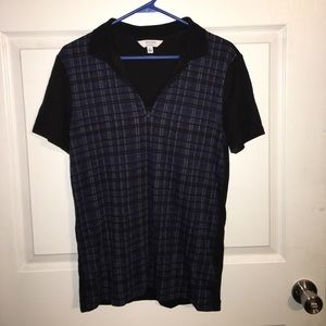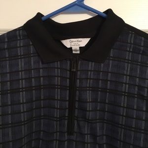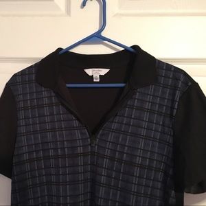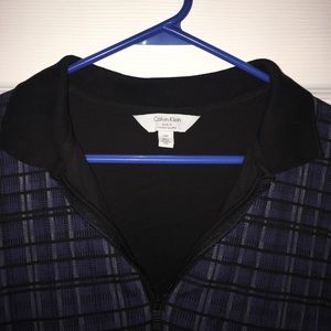Navy blue, black, and grey Checkered front and solid black back. Solid black zipper