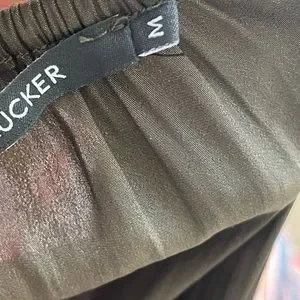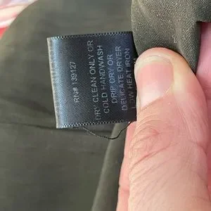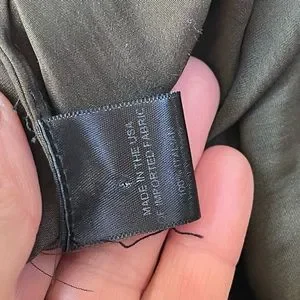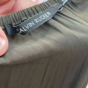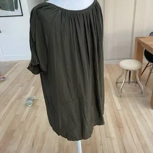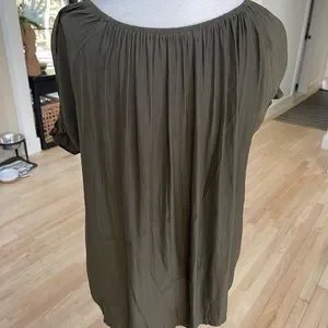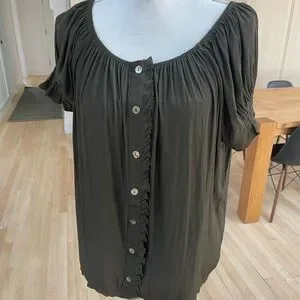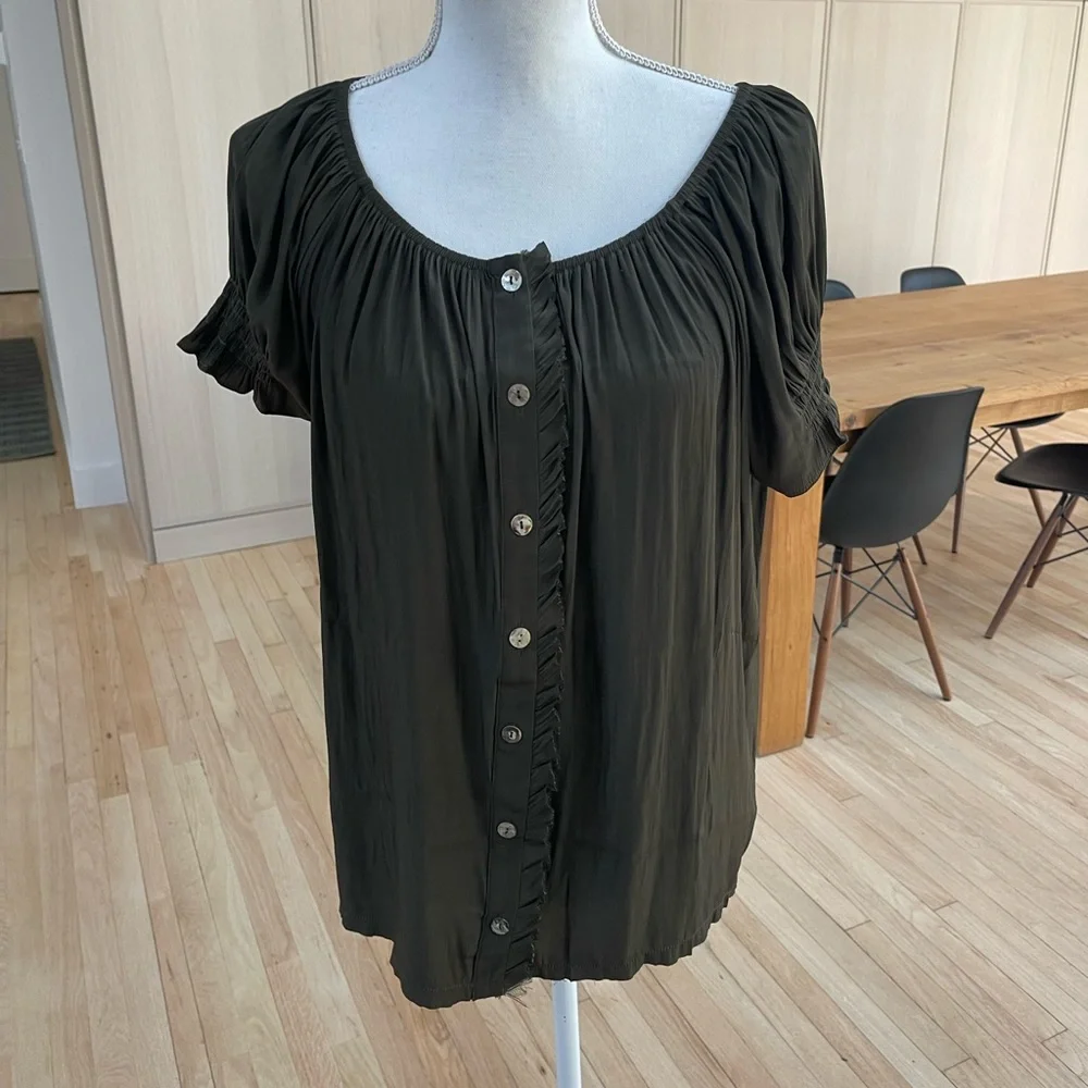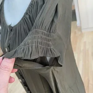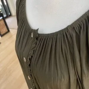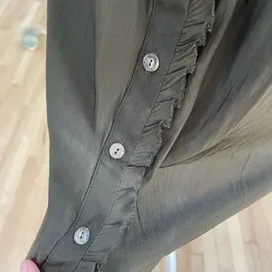 Beautiful blouse. Button down with elastic (not tight, looser) collar. Subtle ruffle down front and on sleeve. Color is not too green. Army color. Wear tucked in or loose. Worn once.