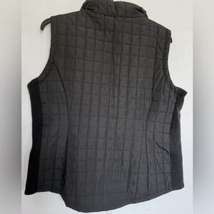 Stylish black quilted vest featuring a cozy fleece collar and zippered pockets.