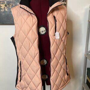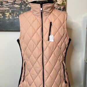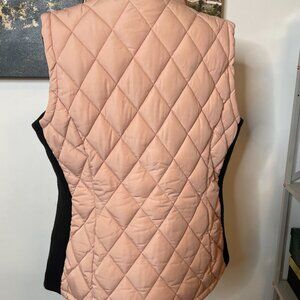 This light blush pink vest features a stylish diamond quilted design with sleek black accents along the zipper and sides for a flattering, modern look. Perfect for layering in transitional seasons, it includes three functional zip pockets (two side and one chest), and a high collar for added warmth and style.