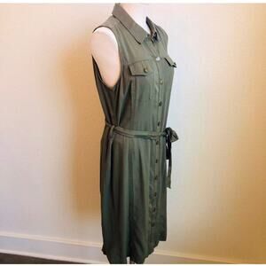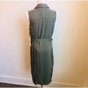 NEW with tags! This CALVIN KLEIN sleeveless dress in Caper Green is made with wide notch lapels, button front closures, a tie belt at the waist, and a gently flared, flowing a-line silhouette. Size 8. 100% Vicose