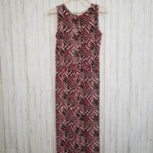 Full length sleeveless jumpsuit. Red, white & black geometric print. On the back, there is a zipper that goes down to the waist.