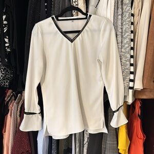 Calvin klein top with contrast black inset details and gold beaded buttons at each sleeve. Poly spandex. 19.5” at bust and 27.5” long.