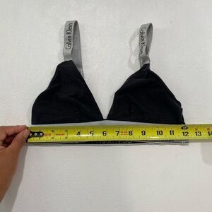 Comfy and stylish Calvin Klein bralette in classic black with grey logo band and branded elastic straps. Triangle cut with light support — perfect for lounging, layering, or everyday wear. Size M (90cm bust), made in Indonesia. Gently worn, in great condition.
