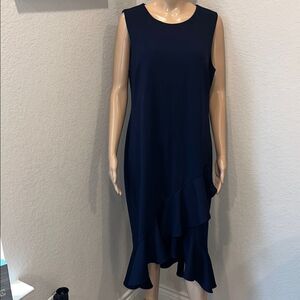 This Calvin Klein dress in a striking blue hue features a ruffled asymmetrical hem that adds a touch of flair to its sleek sheath silhouette. The sleeveless design and crew neck make it perfect for both casual outings and work settings, offering a blend of style and comfort.