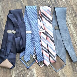 Stylish tie set from Calvin Klein Collection. Includes solid black, striped blue, pink with stripes, and dotted gray ties. Perfect for any occasion.