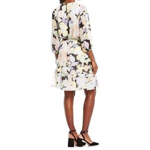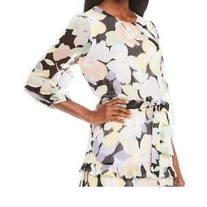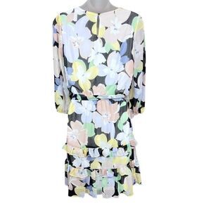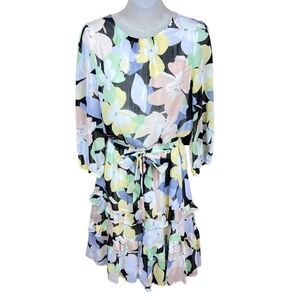 Dress Blouson Waist by Calvin Klein in Black White Purple Yellow Floral Print with Elastic Waist with Fabric Tie Belt 3/4 Sleeves Elastic Cuff Ruffled Layered Hem Women XS