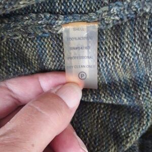 Non itch acrylic marled green, blue and brown sleeveless knit turtleneck knee length tunic sweater dress with 2 front fold over patch pockets by Calvin Klein