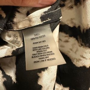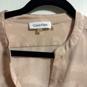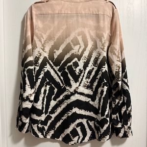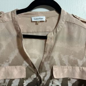 Calvin Klein Women’s Button Down Shirt. Size Med. Pinkish peach and brown. Ombré /Graphic. Polyester. Soft and spunky blouse. Great with Jeans and boots.