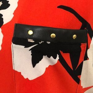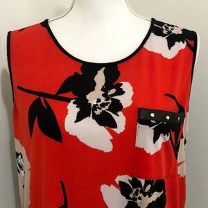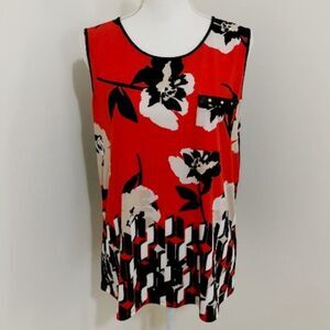 Vibrant red blouse with bold floral print. Sleeveless design. Perfect for any occasion.