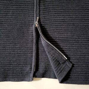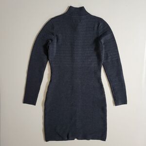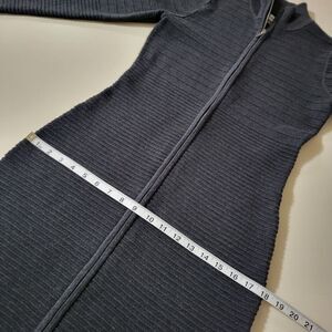 Fully fashioned dress by Calvin Klein featuring long sleeves and a ribbed mock turtleneck. With tonal textured stripes, the center front exposed zipper can be worn zipped up or zipped down. The two-way zip allows you to customize how much skin you reveal at the neckline and hem. It's made from ribbed acrylic-poly blend that closely hugs and accentuates your curves. Perfectly chic worn with metallic accessories. New condition.
