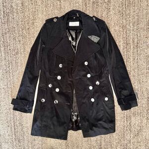 Color is black with multiple silver buttons, double breasted, waterproof polyester material