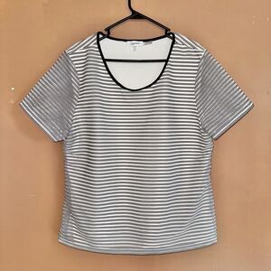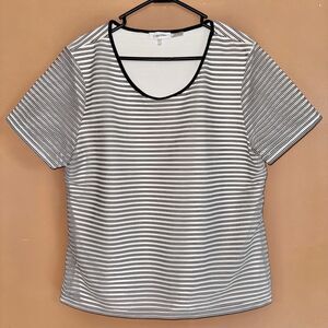 It features a chic black and white sheer stripe design, a comfortable crew neck cut, and short sleeves. The top is in great condition and ready for its new home.