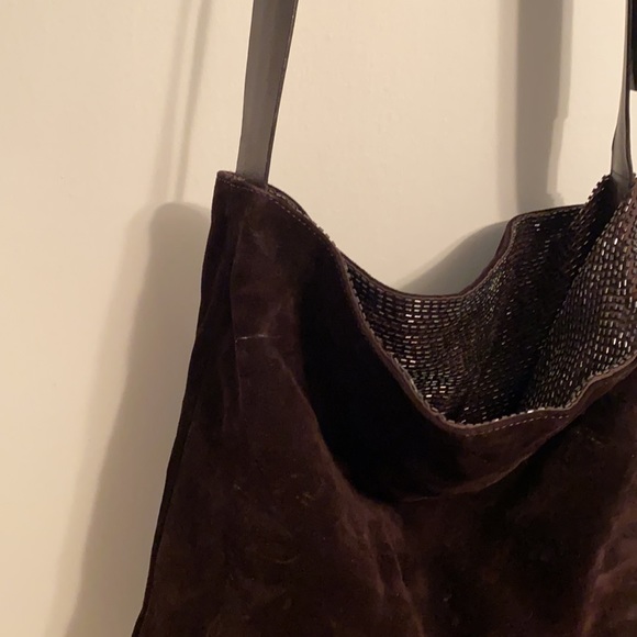 Calvin Klein couture brown suede Crossbody messenger bag with beaded collar and satin lining. And inside zip Worn see photos. Magnetic snap closure
