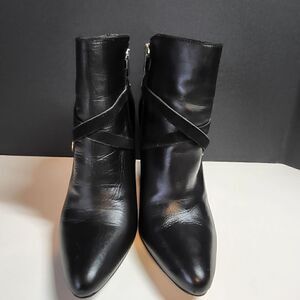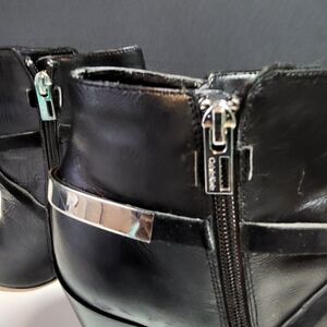 Calvin Klein black ankle boots. Size 10 medium. 5" heels. Zips up on the side. A Strap on both boots is missing...as shown in the last two photos.