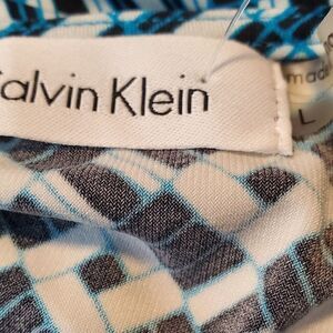 (II) Calvin Klein Blue & Black Geometric Silky Tank Top. It does not have a fabric tag but my best guess it is a polyester/cotton blend.