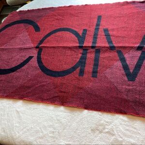 Calvin Klein Knit Acrylic Blanket Shawl. Red toned shawl in excellent condition. Black lettering. Great fall colors. Measures width 27”, length 72.5”.