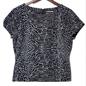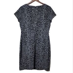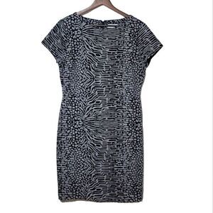 Beatiful animal print from Calvin Klein mini dress size 12P. Dress has stretch to it, making it comfortable to wear. A hidden zip closure at the back. Belt missing. Great condition. Pit to pit measurement is 20 inches. Dress Lenght 35.5 inches. Color: Black and Gray