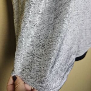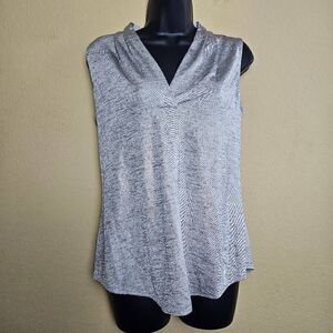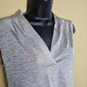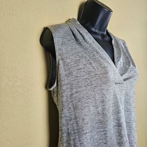 This is a sleeveless blouse by Calvin Klein. It is grey with shimmering silver metallic threads throughout. This blouse has a v-neckline with pleating.