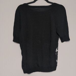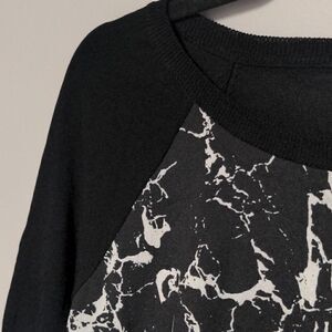 Black and white short sleeve light weight sweater. Sleeves and back are solid black, front panel is black and white marble. Two different materials as well