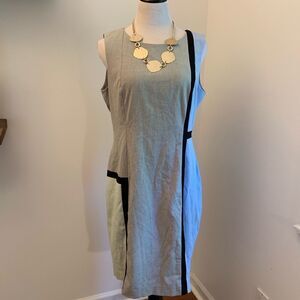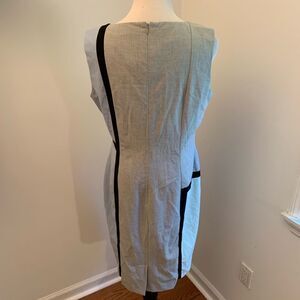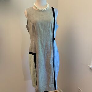 Calvin Klein sleeveless shift dress with color blocking, fully lined, overall stretch and a hidden back zipper. Bust 40”, waist 38” and length 39”.