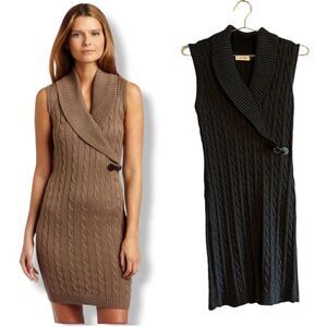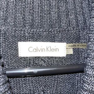 Beautiful dark gray sleeveless sweater dress from Calvin Klein, in a size large. Featuring shawl like collar, beautiful cable knit material, and side buckle detail. Unlined but thicker material. Dress is in great preworn condition with minor pilling noted throughout but mainly noted at the bottom and hem (please see all photos and video above); any questions please ask ✨