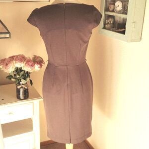 Dark taupe knit that is a little heavier and structured. The neckline is tucked and stitched around the boatneck. Cap sleeves. Back zip. Waist seam, belt loops, sorry, no belt. Size 8 measures 38 at chest, 30 at waist, 42 at hips, 38 at bottom hem for a perfect pencil shape. This is a classic beauty.