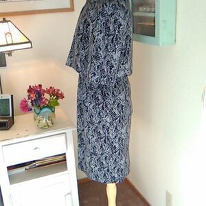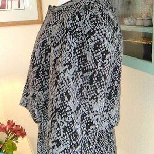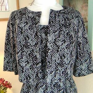 Gray and black jacquard fabric in a design that suggests a reptile print. A more substantial weight. Soft and unlined. Back zip. Pockets. Flattering square neckline. 38 at chest, 30 at waist, 40 at hips. 38 long from shoulder to hem. Cute little bolero jacket fits comfortably over dress.