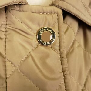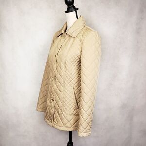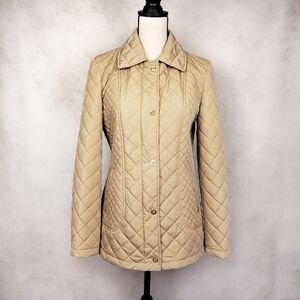 Tan beige medium length puffer coat with front zip closure with snap placket, diamond quilting and two side pockets in excellent preowned condition with no visible signs of wear. Size Extra Small. Shouder to shoulder 16", pit to pit 19", length 27", sleeve 24.5".
