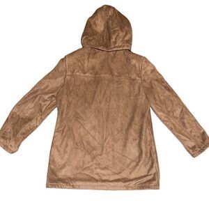 Elevate your outerwear game with this stylish hooded coat from Calvin Klein. Crafted from polyester, this solid beige coat features a zip closure, long sleeves, and a silky lining for ultimate comfort. The hip-length coat is perfect for women in size L, with a detachable hood to protect you from the elements. It measures 23in pit to pit and 30in shoulder to hem.