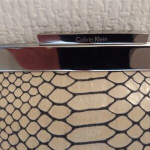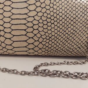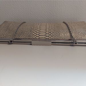 Mint condition, gently used. 4"h x 11"w x 1.5"d & silver chain has a 12 inch drop & can fold inside to be carried as a clutch. Top has silver clip closure. Inside has a zipper pocket & satin poly blend. Beautiful beige and blue tones go with the silver lining š