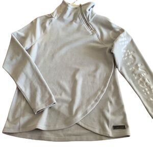 Calvin Klein size small gray fleece pullover with quarter zipper. So warm and cozy and seems to run large… May be because of the wrap-like design. Like new condition and smoke free/pet free home