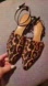 like new, faux ponyhair leopard print mules. strap around ankle.