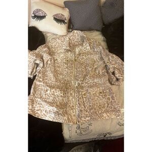 This is a tan leopard print zip up linen blouse jacket very nice very classy has a drawstring at the waist to give it a more fitted look runs oversize sleeves roll up to make it a little bit shorter a little bit longer than a short sleeve but not a three-quarter sleeve either has custom gold hardware all engraved with Calvin Klein homage if you have any questions feel free to message me