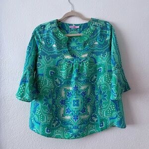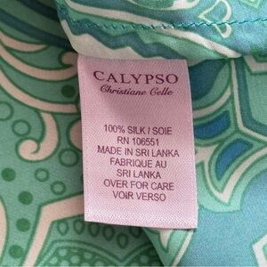 Calypso Christiane Celle XS Green Blue Paisley 100% Silk Blouse Bell Sleeve
