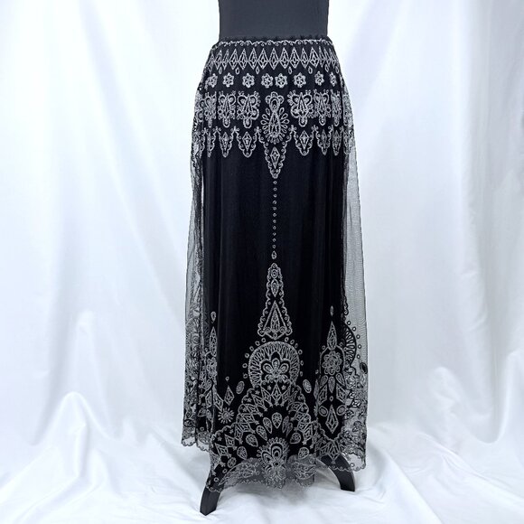 Stand out wearing this gorgeous skirt is a black, tulle, maxi-length skirt. The detailed white embroidery has a silver look. It has an elastic waist that is 26 inches unstretched and 40 stretched.