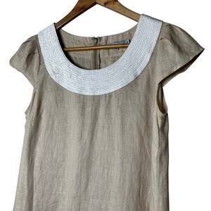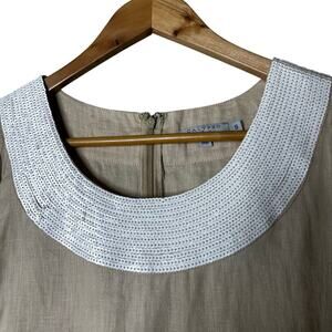 Calypso St Barth Linen Dress Taupe with Pearl Type Sequins Vacation Luxury Cruise Party Preppy Shift Crew Neck Knee Length Back Zip Closure