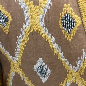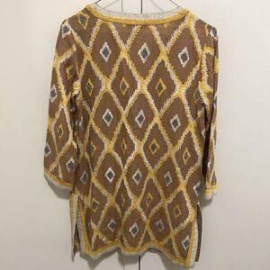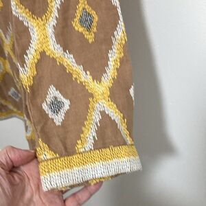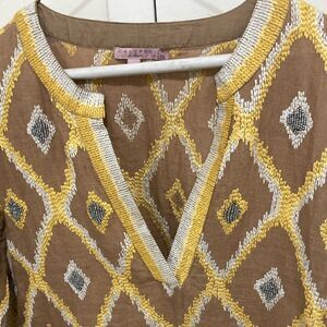 Calypso St.Barth classic linen tunic/mini dress with 3/4 sleeve ,round collar with V neck and side vents. Tan lined embroidered in white & yellow geometric pattern with silver beads. Neckline, cuff and hem has embroidered border.