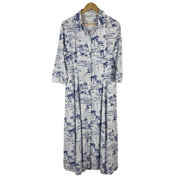 Calypso St Barth Maxi Shirt Dress Linen Button Front 3/4 Sleeve White Blue