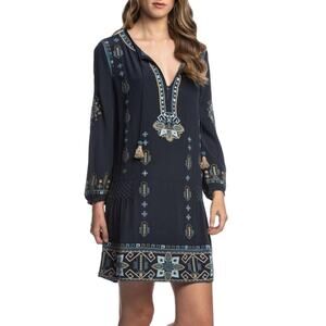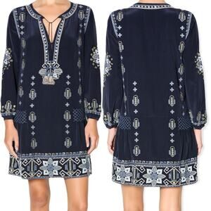 NWT Bohemian luxe is so you! Stunning silk dress in navy with incredible embroidery details and a beautiful palette incorporating light greys, blues and greens. 3/4 sleeve embroidered silk dress with tassel front tie. Wear as a dress or tunic with leggings and booties.